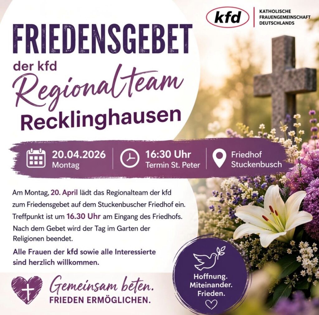 Der 11. Oktober 1956 gilt als Geburtstag des Friedensgebetes der Katholischen Frauengemeinschaft Deutschlands. Der Anlass zu diesem Gebet war die Zeit nach dem zweiten Weltkrieg.