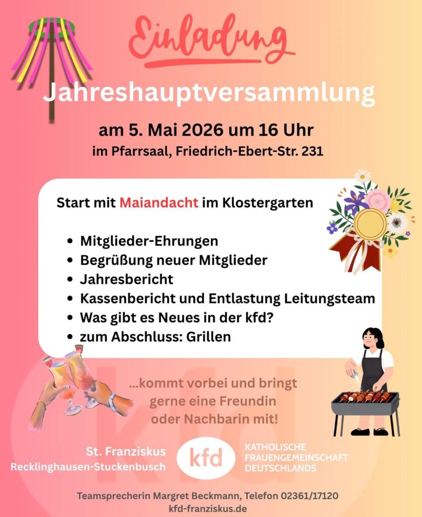 um 16.00 Uhr mit einer Maiandacht anschl. Jahreshauptversammlung mit
